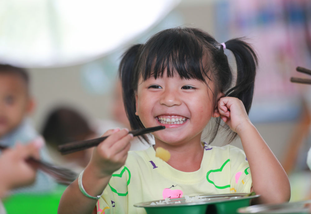 ↑貴州省從江縣剛邊壯族鄉(xiāng)中心幼兒園的小朋友在享用免費營養(yǎng)午餐(9月15日攝)。