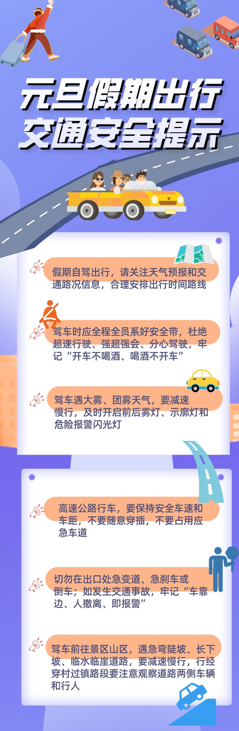 公安部結(jié)合近三年元旦假期道路交通出行和交通事故規(guī)律特點(diǎn),分析研判2024年元旦假期道路交通安全形勢(shì)。據(jù)研判,元旦假期旅游客運(yùn)安全風(fēng)險(xiǎn)突出,跨年賀歲活動(dòng)多,溫泉游、滑雪游、農(nóng)家樂等旅游出行頻繁,多家在線旅游平臺(tái)元旦假期旅游訂單量同比增長超3倍,旅游客運(yùn)、公路客運(yùn)、自駕車超員載客、超速行駛等違法肇事易發(fā)多發(fā)。