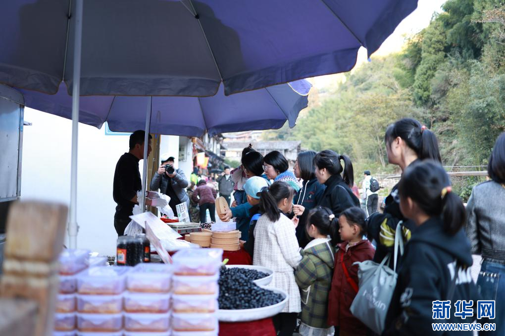 攤位前,不少游客正在詢問農(nóng)副產(chǎn)品的價格。“游客多的時候每天可以賣兩三千元。”村民毛守珍說,她提前半年就開始備貨,制作彩色素面、柿子干、番薯棗等。
