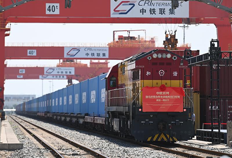 △2023年8月3日,中歐班列(西安-塔什干)陜?yōu)踅?jīng)貿(mào)合作隆基綠能光伏組件出口專列在西安國際港站準(zhǔn)備發(fā)車。