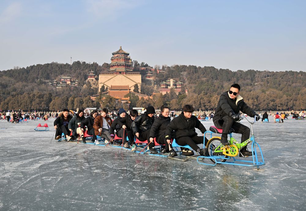 2024年1月1日,游客在北京頤和園冰場玩冰車和冰上自行車。新華社記者 陳曄華 攝
