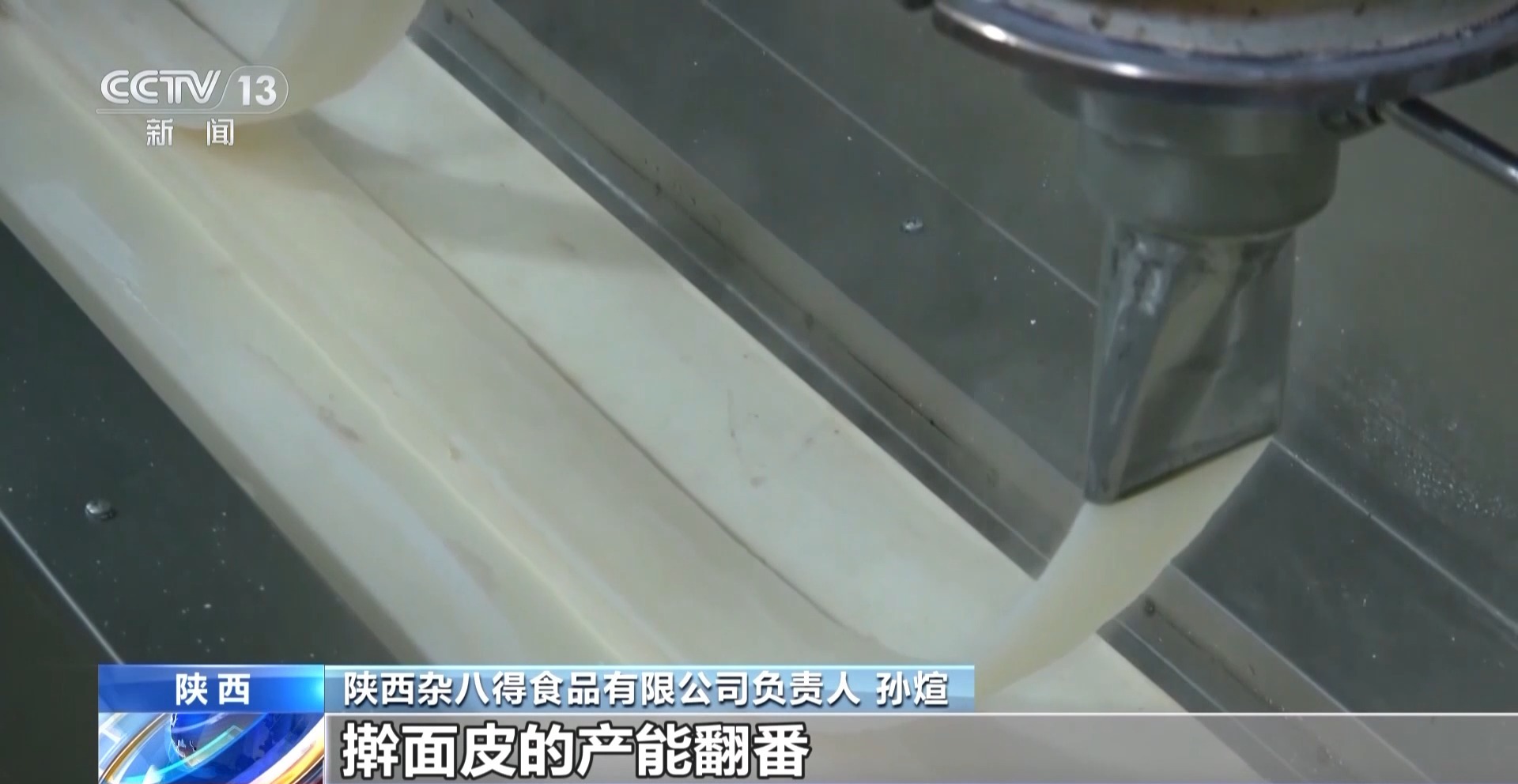 陜西雜八得食品有限公司負(fù)責(zé)人 孫煊:靠手工滿足不了現(xiàn)在的消費(fèi)需要,最主要是產(chǎn)能保障不了。現(xiàn)在搟面皮由生變熟依靠這個(gè)專利技術(shù)來實(shí)現(xiàn),搟面皮的產(chǎn)能翻番,每分鐘一臺(tái)單機(jī)達(dá)到60公斤的產(chǎn)能。