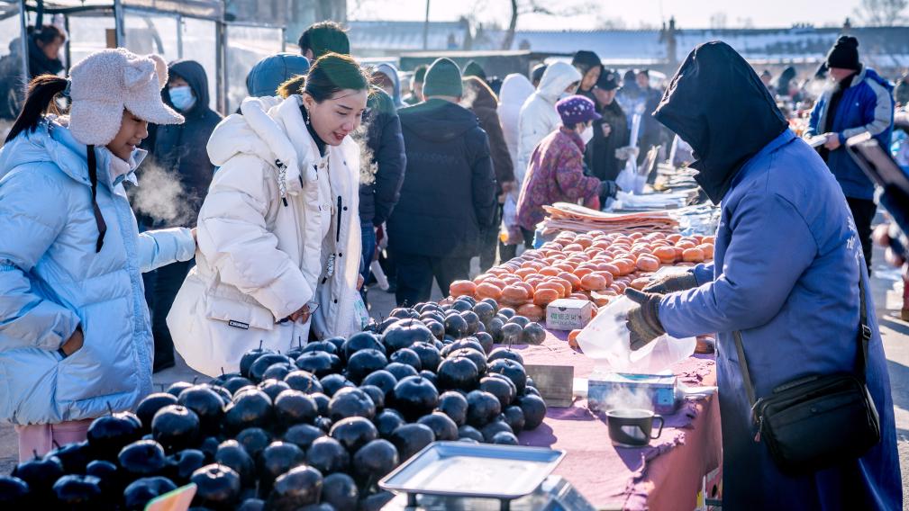 顧客在吉林省長(zhǎng)春市近郊的卡倫大集上購(gòu)買凍梨和凍柿子(1月18日攝)。新華社記者 唐成卓 攝
