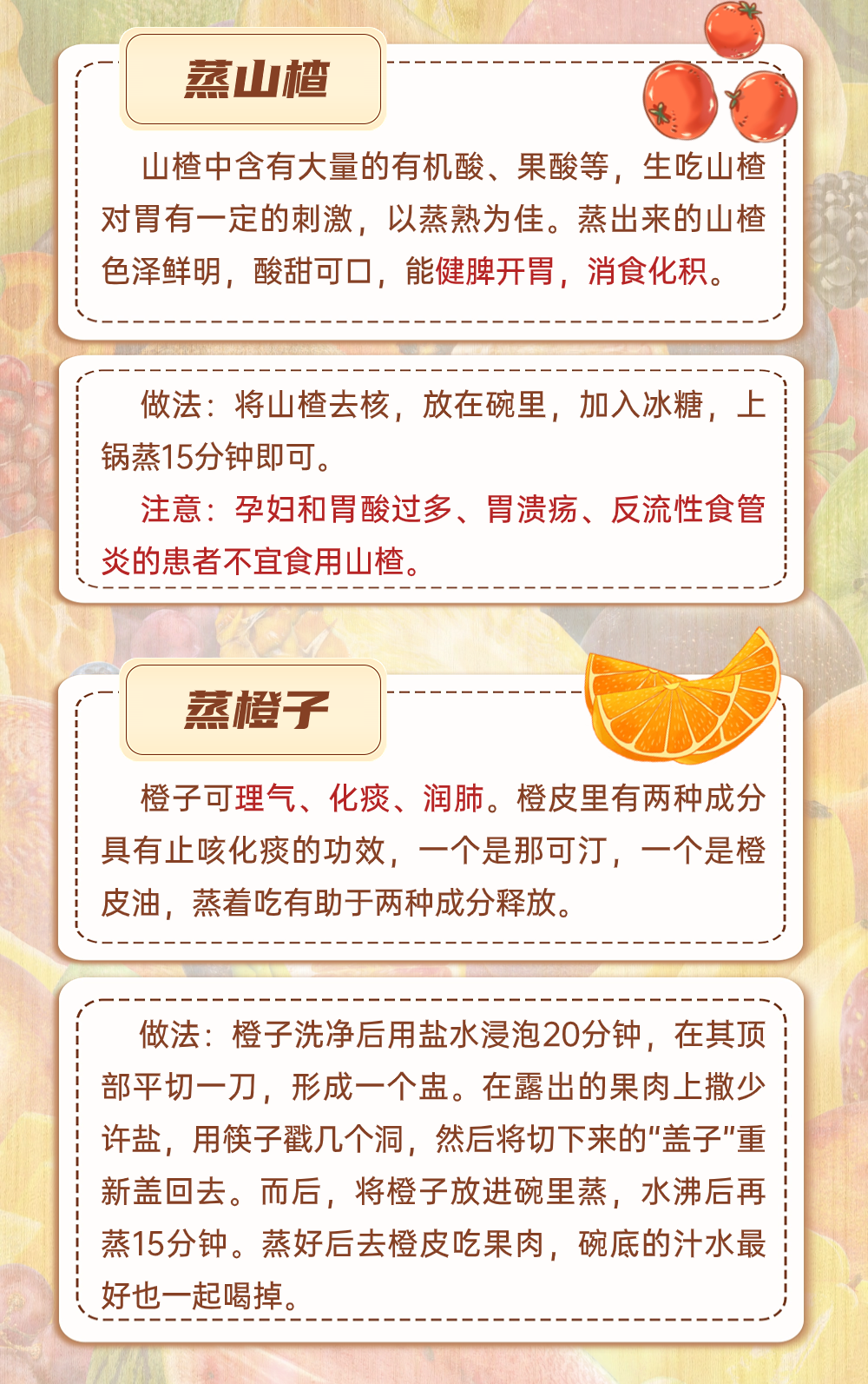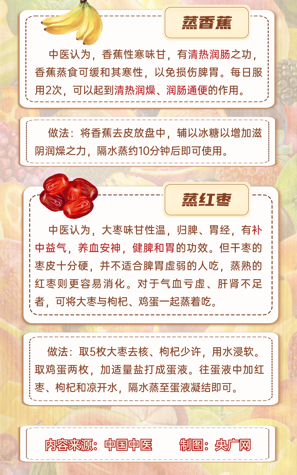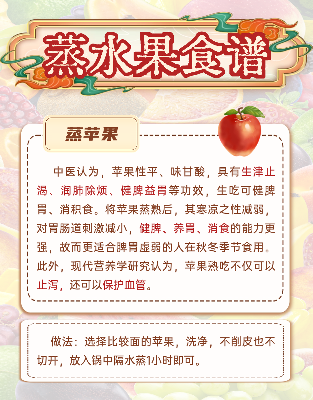 那么,應(yīng)該怎樣蒸水果呢?不同水果蒸著吃,對健康有哪些好處呢?請收好這份蒸水果食譜。(記者 雷妍 實習記者 王佳路)