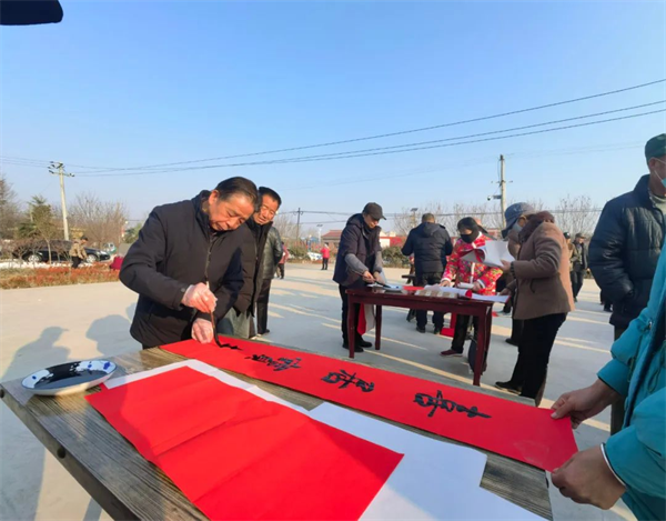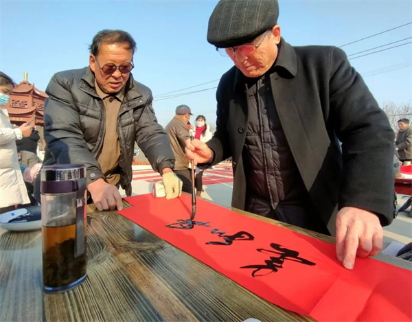 書法家協(xié)會的數(shù)位書法家揮毫潑墨,將濃濃新春祝福凝在筆端,為村民免費(fèi)書寫、贈送新春對聯(lián)。村中心廣場上,鑼鼓聲聲震天響,火紅的扇子舞動翩翩,男女老少紛紛沉浸在喜慶的活動氛圍中。