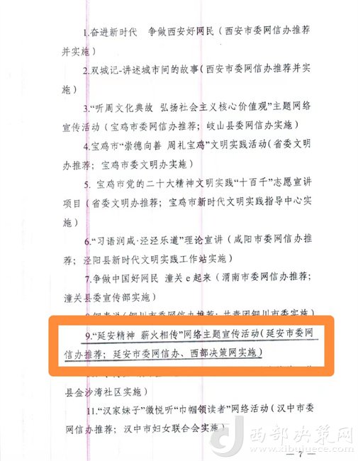 活動經(jīng)過推選、初審、復(fù)審等環(huán)節(jié),評出2023年陜西好網(wǎng)民30名、陜西好網(wǎng)民工程品牌40個、優(yōu)秀組織單位10家。由延安市委網(wǎng)信辦薦送,延安市委網(wǎng)信辦、西部決策網(wǎng)實施的“延安精神 薪火相傳”網(wǎng)絡(luò)主題宣傳活動被評為2023年陜西好網(wǎng)民工程品牌項目。