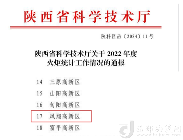 西部決策網(wǎng)訊 近日,陜西省科技廳下發(fā)了2022年度火炬統(tǒng)計工作情況的《通報》,鳳翔高新區(qū)在火炬統(tǒng)計工作中完成任務(wù)及時、填報審核嚴格、工作成效突出,被省科技廳通報表揚,這已經(jīng)是鳳翔高新區(qū)連續(xù)四年獲通報表揚。
