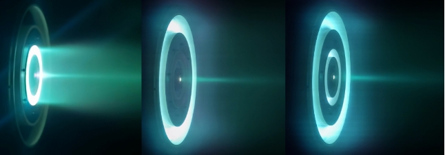 ▲嵌套式霍爾推力器點(diǎn)火圖像(左:內(nèi)環(huán)工作,中:外環(huán)工作,右:雙環(huán)同時(shí)工作)