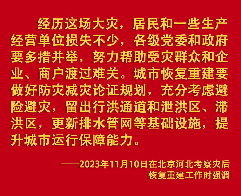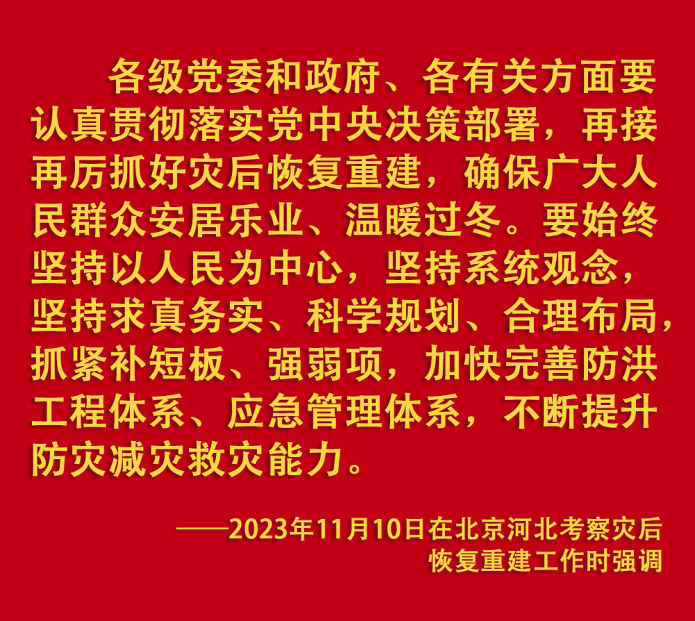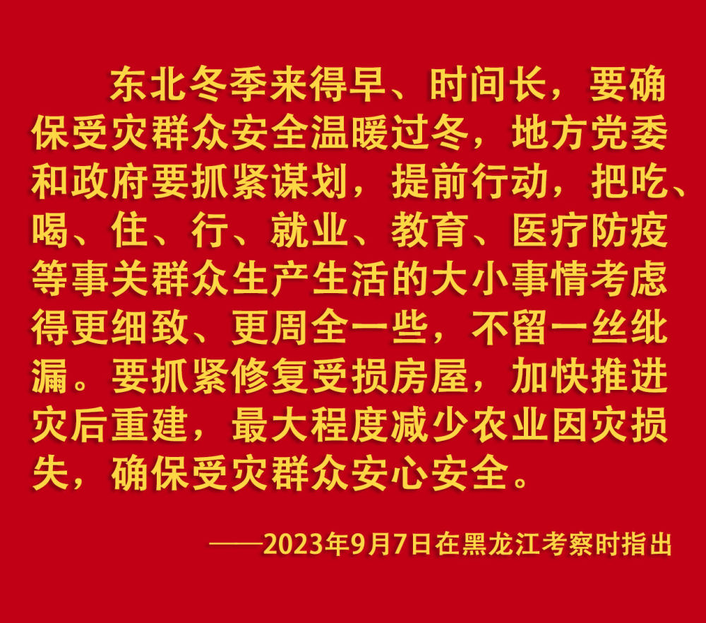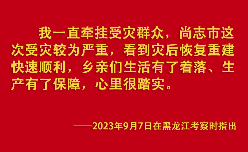 2023年汛期以來(lái),我國(guó)華北、東北等地出現(xiàn)極端降雨,引發(fā)洪澇和地質(zhì)災(zāi)害。習(xí)近平一直牽掛著受災(zāi)群眾,高度重視防汛抗洪救災(zāi)和災(zāi)后恢復(fù)重建工作,多次作出重要指示批示,要求有關(guān)地方和部門全力保障人民群眾生命財(cái)產(chǎn)安全,盡快恢復(fù)災(zāi)區(qū)正常生產(chǎn)生活秩序。2023年9月上旬,習(xí)近平前往黑龍江尚志市看望慰問(wèn)受災(zāi)群眾;11月,北方入冬之際,習(xí)近平又來(lái)到北京、河北受災(zāi)較重的相關(guān)地區(qū),看望慰問(wèn)受災(zāi)群眾,檢查指導(dǎo)災(zāi)后恢復(fù)重建工作。