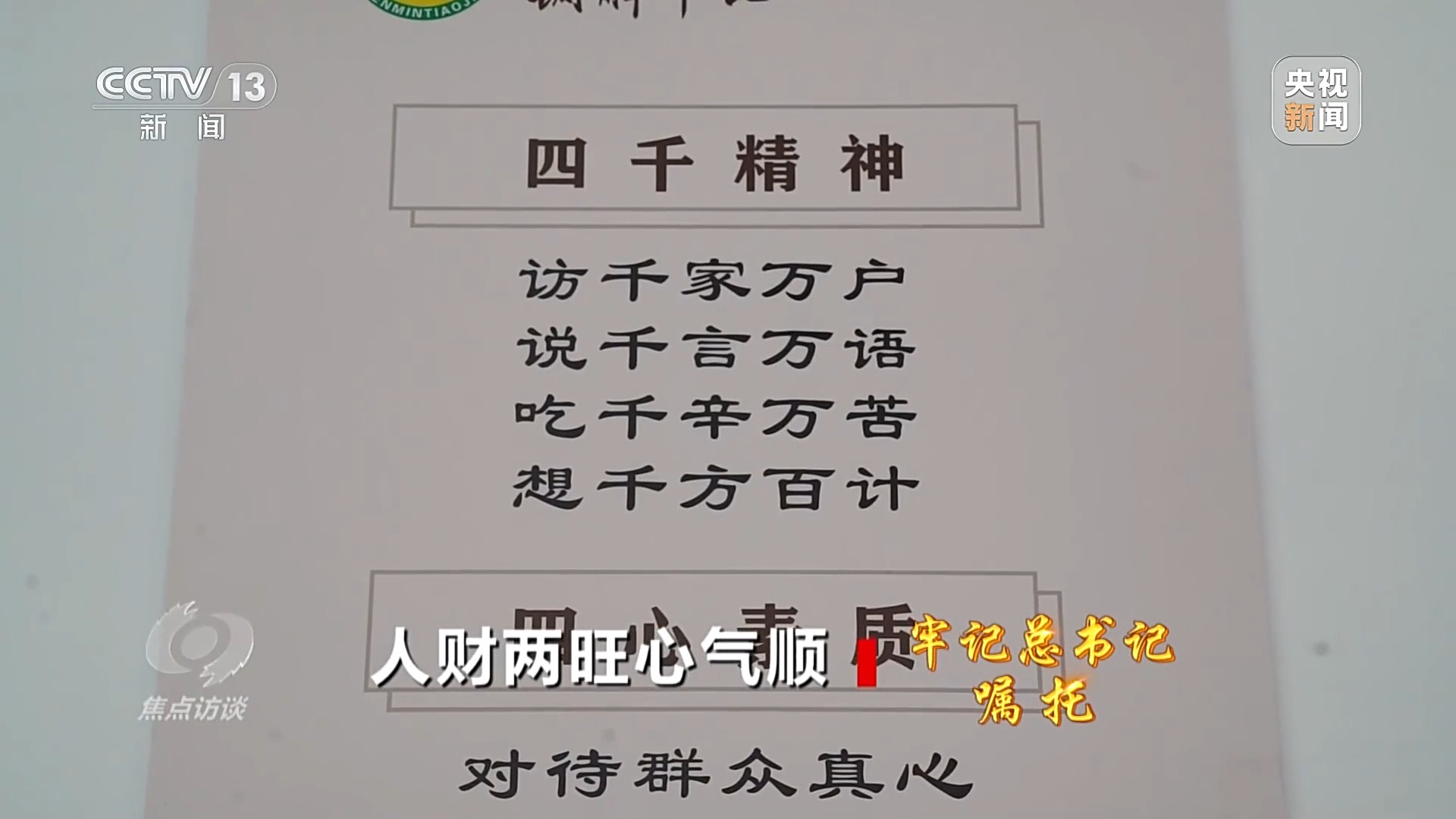 總書記對基層治理的關(guān)注,讓大家的工作更有了勁頭。在老楊調(diào)解中心,墻上掛著“四千精神”,訪千家萬戶、說千言萬語、吃千辛萬苦、想千方百計。30多年來,老楊和團(tuán)隊走訪了185個行政村,每一個村莊都留下了調(diào)解的印記。