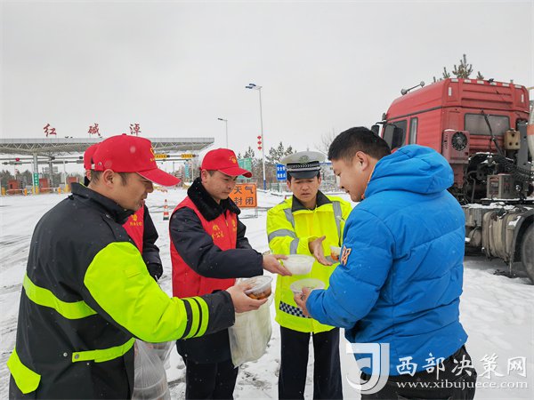 這有小米粥、炸油餅,雞蛋還熱乎著……”榆靖分公司志愿者暖心地喊著話。“行動(dòng)是最好的破冰劑”,志愿者們?yōu)楦咚贉袈每退腿ナ澄?,頂風(fēng)冒雪分發(fā)給滯留在收費(fèi)站的司乘人員。一件件穿梭在寒風(fēng)中的“紅馬甲”此刻成為了冬日里最美的“志愿紅”,讓群眾在寒意逼人的天氣里感受到了一份特別的溫暖。大家紛紛表示感謝,“熱粥、小菜、松軟的饅頭下肚,全身都熱乎了。”一名滯留司機(jī)真誠(chéng)地感激道。