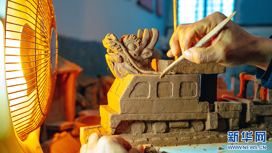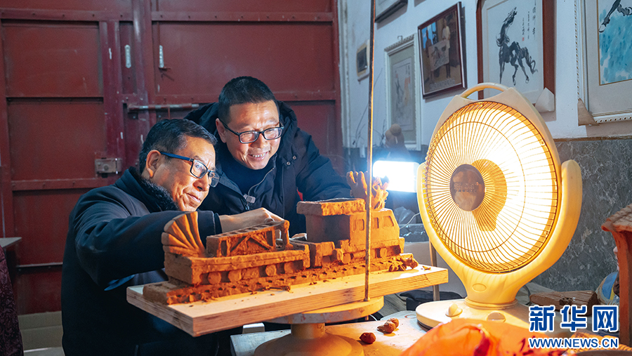在工作室,師父黃忠詳指導劉建強(右)精雕泥塑“龍頭軌道車”。劉一江 攝