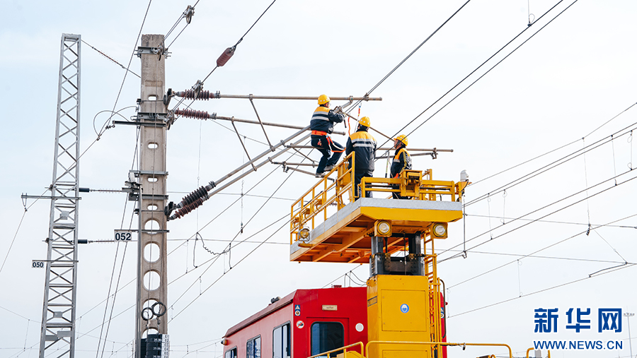 在隴海鐵路虢鎮(zhèn)至陽平區(qū)段,劉建強和他的工友在供電接觸網(wǎng)軌道作業(yè)車上緊固接觸網(wǎng)吊弦。趙 濤 攝