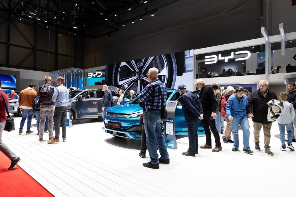 這是2月28日在瑞士日內(nèi)瓦舉行的2024年日內(nèi)瓦國(guó)際車展上拍攝的比亞迪展臺(tái)。新華社記者孟鼎博 攝